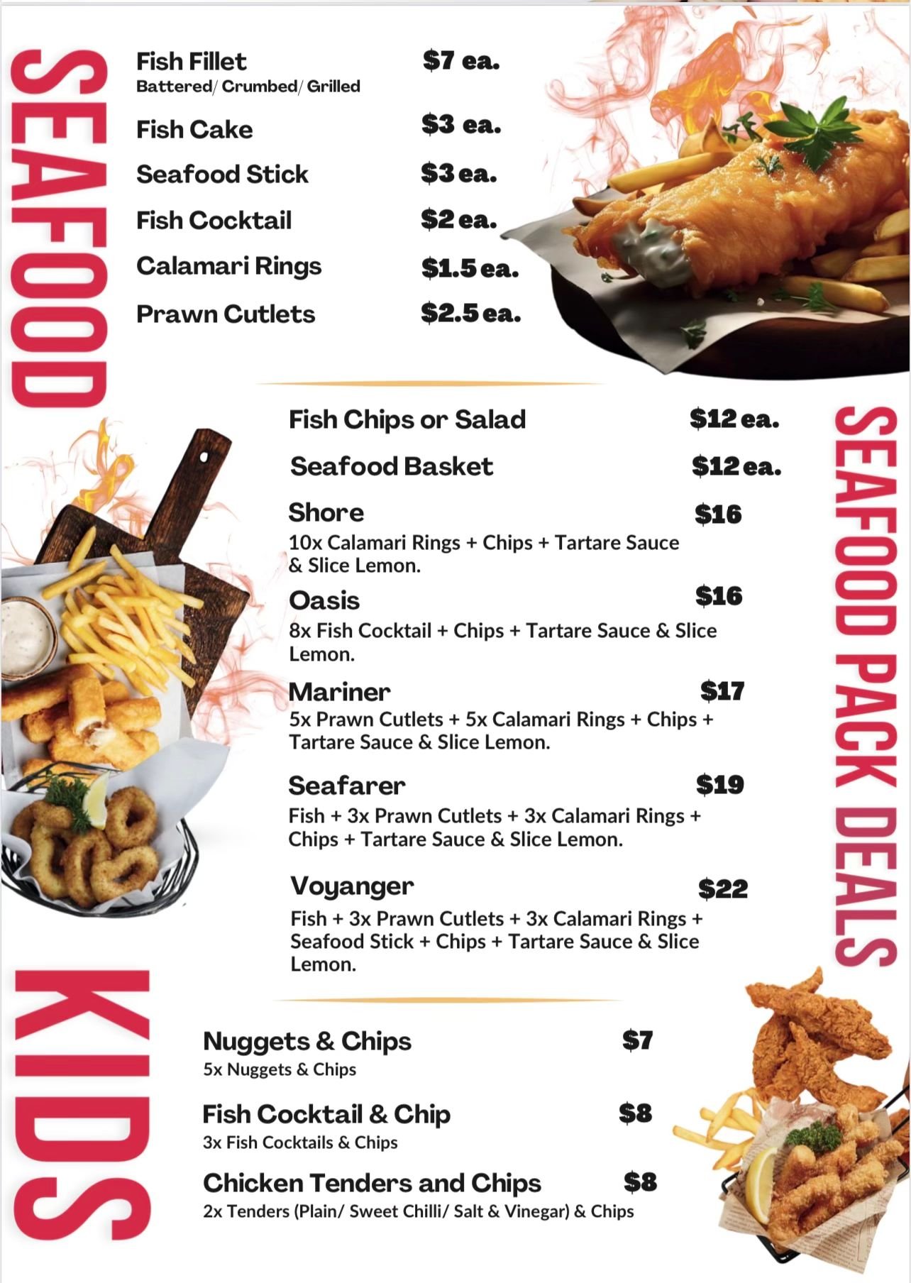 Fish, 3 Prawn Cutlets, 3 Calamari Rings, Seafood Stick, Chips, Tartare Sauce & Lemon. The ultimate seafood feast.