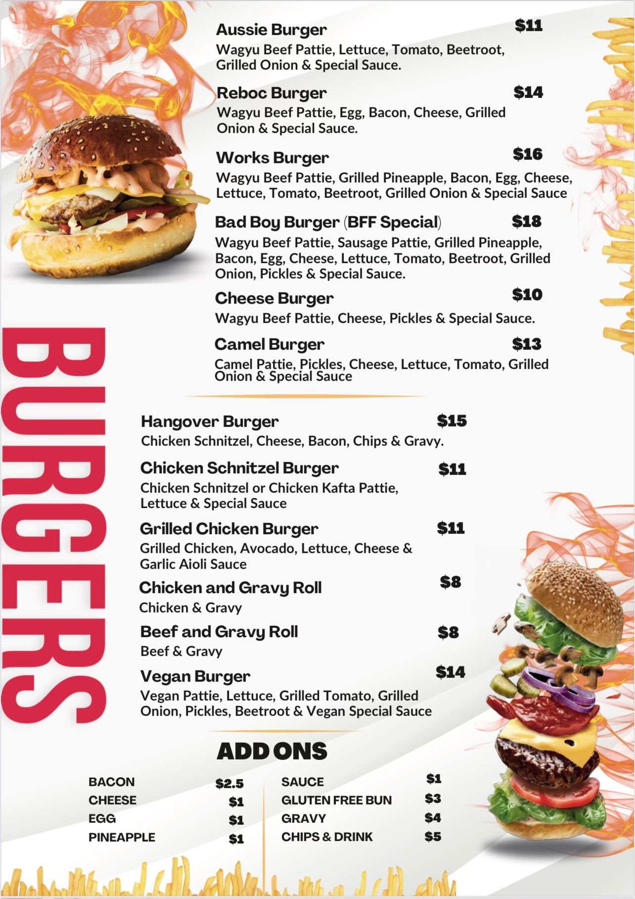 Wagyu Beef Pattie, Sausage Pattie, Grilled Pineapple, Bacon, Egg, Cheese, Lettuce, Tomato, Beetroot, Grilled Onion, Pickles & Special Sauce.
