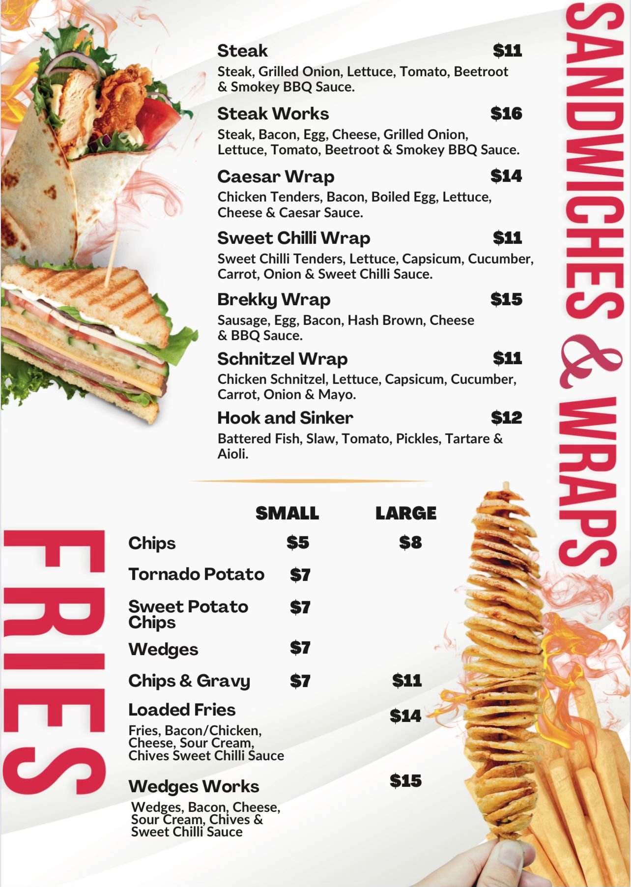 Chicken Schnitzel, Cheese, Bacon, Chips & Gravy.